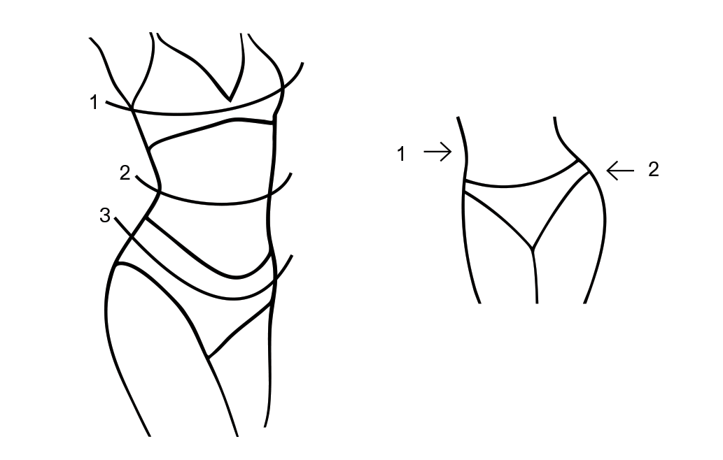 | 2. Hanches | 89/94 cm | 94/99 cm | 99/104 cm | 104/110 cm | 110/115 cm |